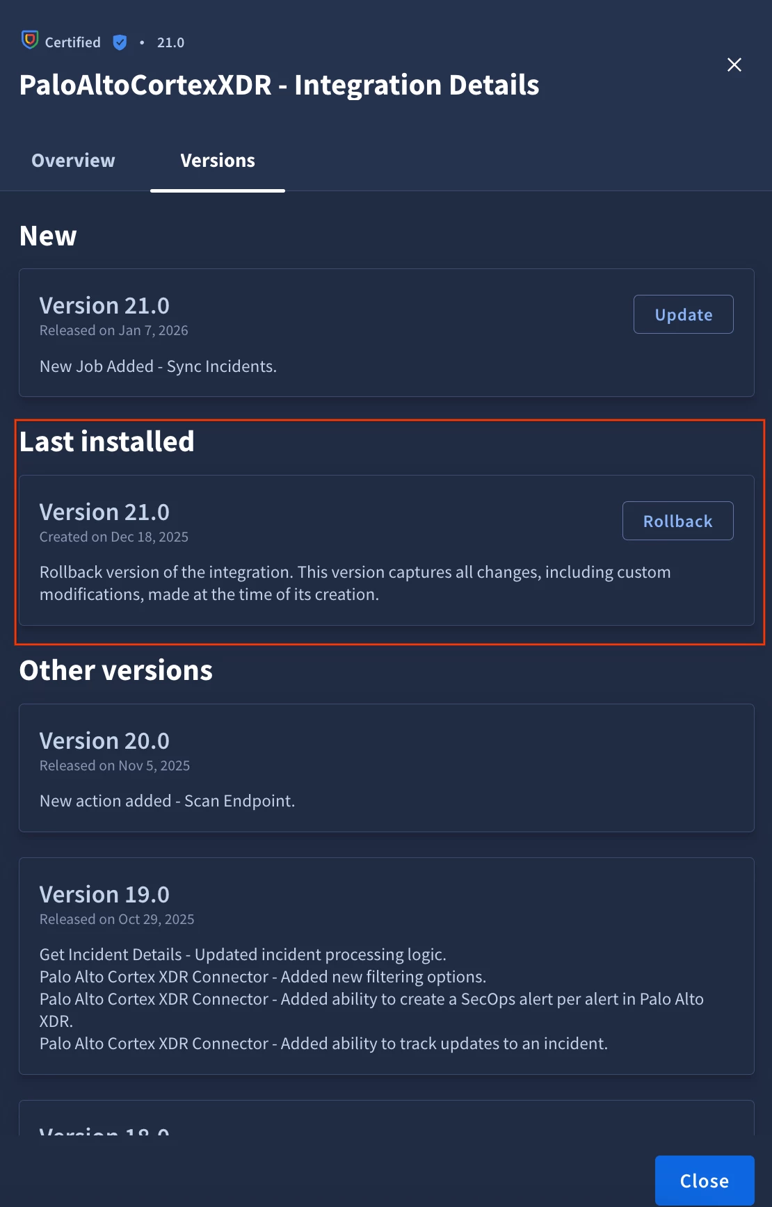 - Rollback will only be available for Response Integrations that were updated since rollback feature was enabled on the instance. For example, if you currently are on version 10 of the Response Integration, there will no ability to roll back to version 9, but if you will update to version 11, you will have access to version 10.