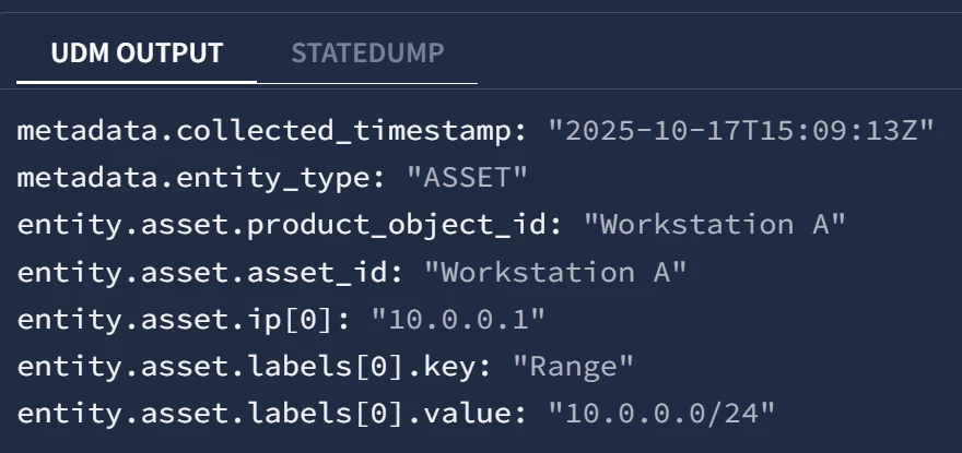 Passing your Asset information with the range but as a fixed string to an entity context feed, i.e. For example add a field in CMDB programmatically to indicate the range for each registered IP, and ingest/parse this info in the entity context within the asset.attribute.labels field as indicated above.