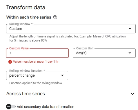 When I attempt to set the rolling window to 7 days in the alert policy configuration screen, I see an error message: “Value must be at most 1 day 1 hr.” Please see the attached screenshot for reference.