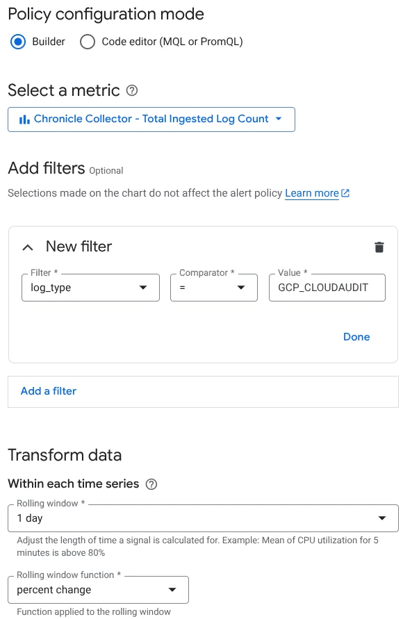However, I’m specifically interested in whether Cloud Monitoring can compare the current log ingestion volume to the average from one week ago, and trigger an alert if there is a deviation greater than 20%.