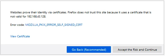 now we can surf into the portal using the given address, as there is no valid certificate you’ll have to add the address to the exception list and continue: