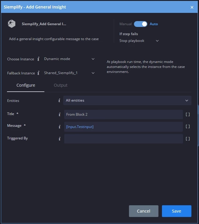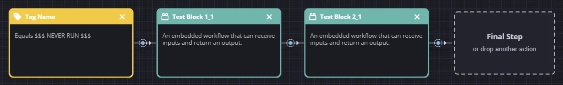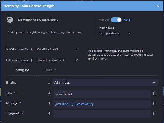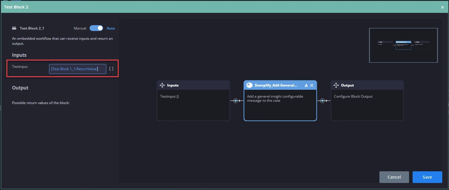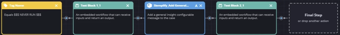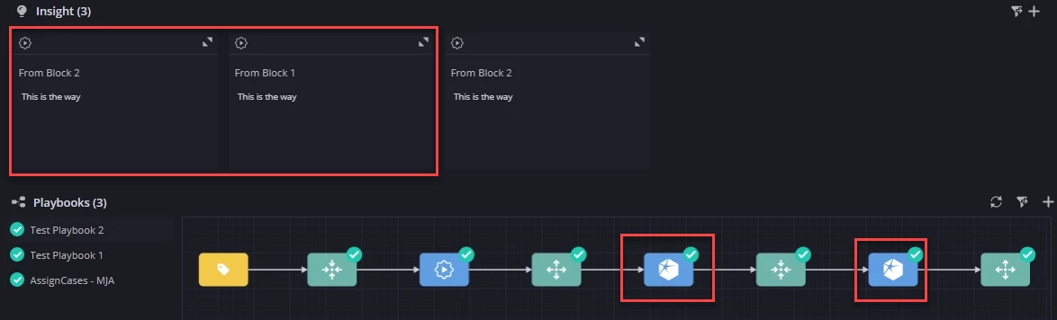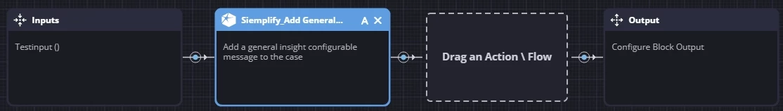 2. Test Block 2 takes the output of Test Block 1 and sets it as the input of Test Block 2, which is then used in a general insight action in this example.