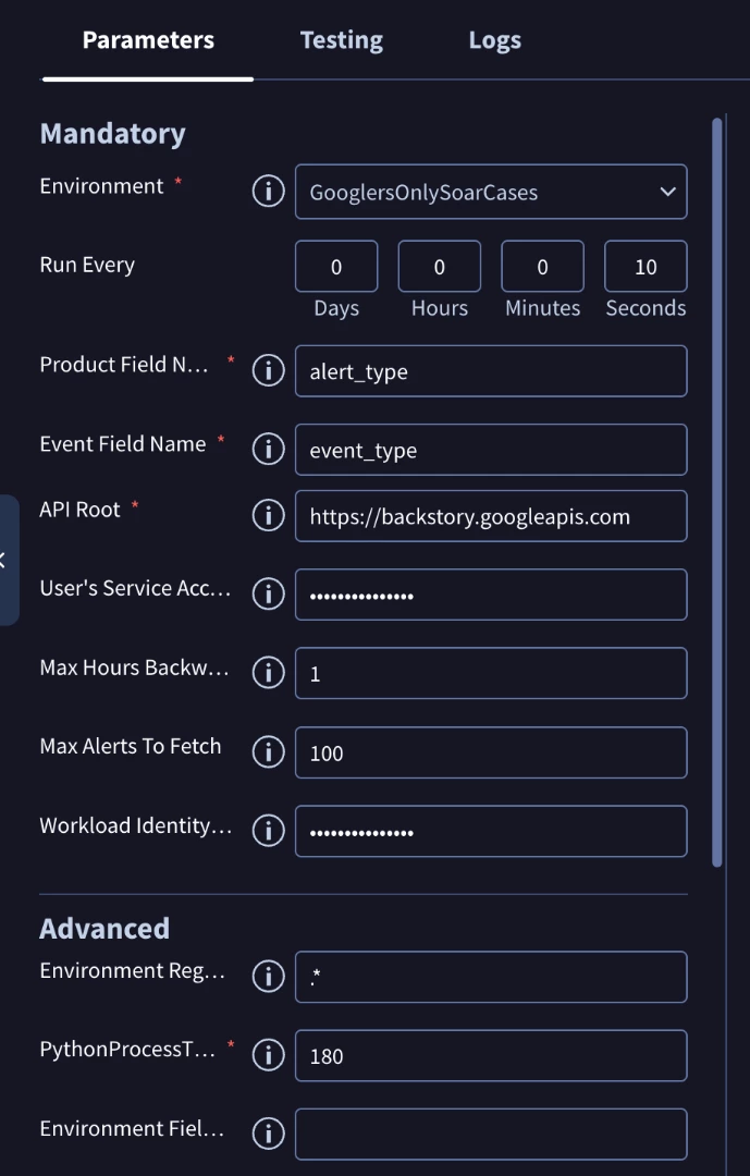 If the field value in the log is the exact environment name (e.g., "source": "Production"), use .* as the pattern. The connector will attempt to match the full value to an environment name defined in your SOAR settings. If the names do not match exactly (case-sensitive), the alert may fall back to the Default Environment defined in the connector.