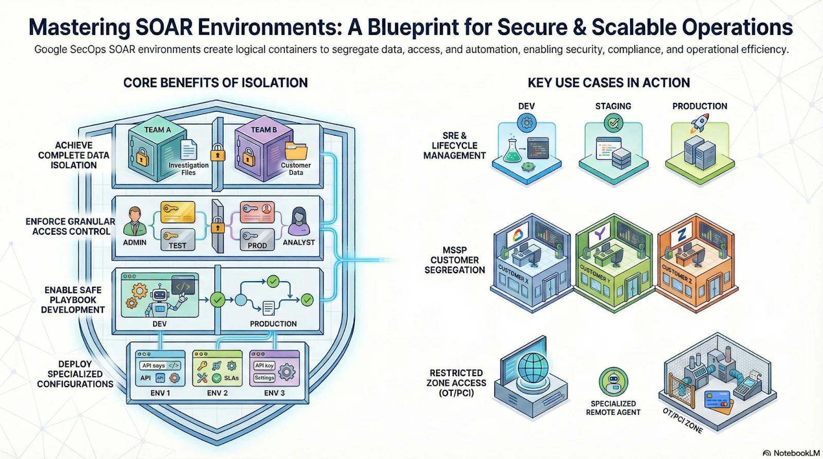 The utilization of multiple environments is a cornerstone of scalable and resilient security operations within Google SecOps SOAR. By strictly segregating data, tailoring access, and customizing automation workflows, you ensure that high-stakes activities like production responses are protected from development testing, and that specialized security teams or MSSP customers maintain necessary isolation.