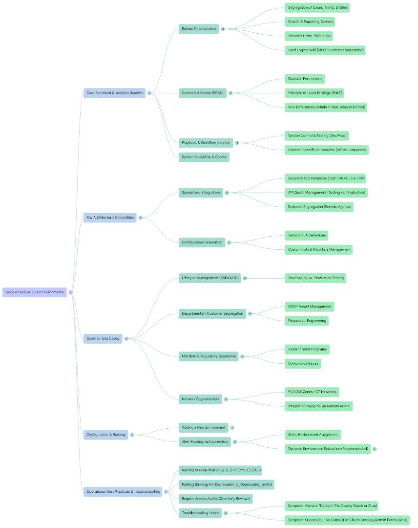 Multiple Environments in Google SecOps SOAR (Security Orchestration, Automation, and Response) serve as critical logical containers, enabling robust data segregation, controlled access, and specialized automation workflows. Leveraging environments is a best practice for organizations and Managed Security Service Providers (MSSPs) seeking to run diverse security operations from a single platform instance. By treating a single instance as a multi-tenant architecture, organizations can maintain a "Single Pane of Glass" for high-level oversight while enforcing strict boundaries at the operational level. This architecture prevents data leakage, simplifies compliance auditing, and allows for the safe simultaneous execution of disparate security mandates.