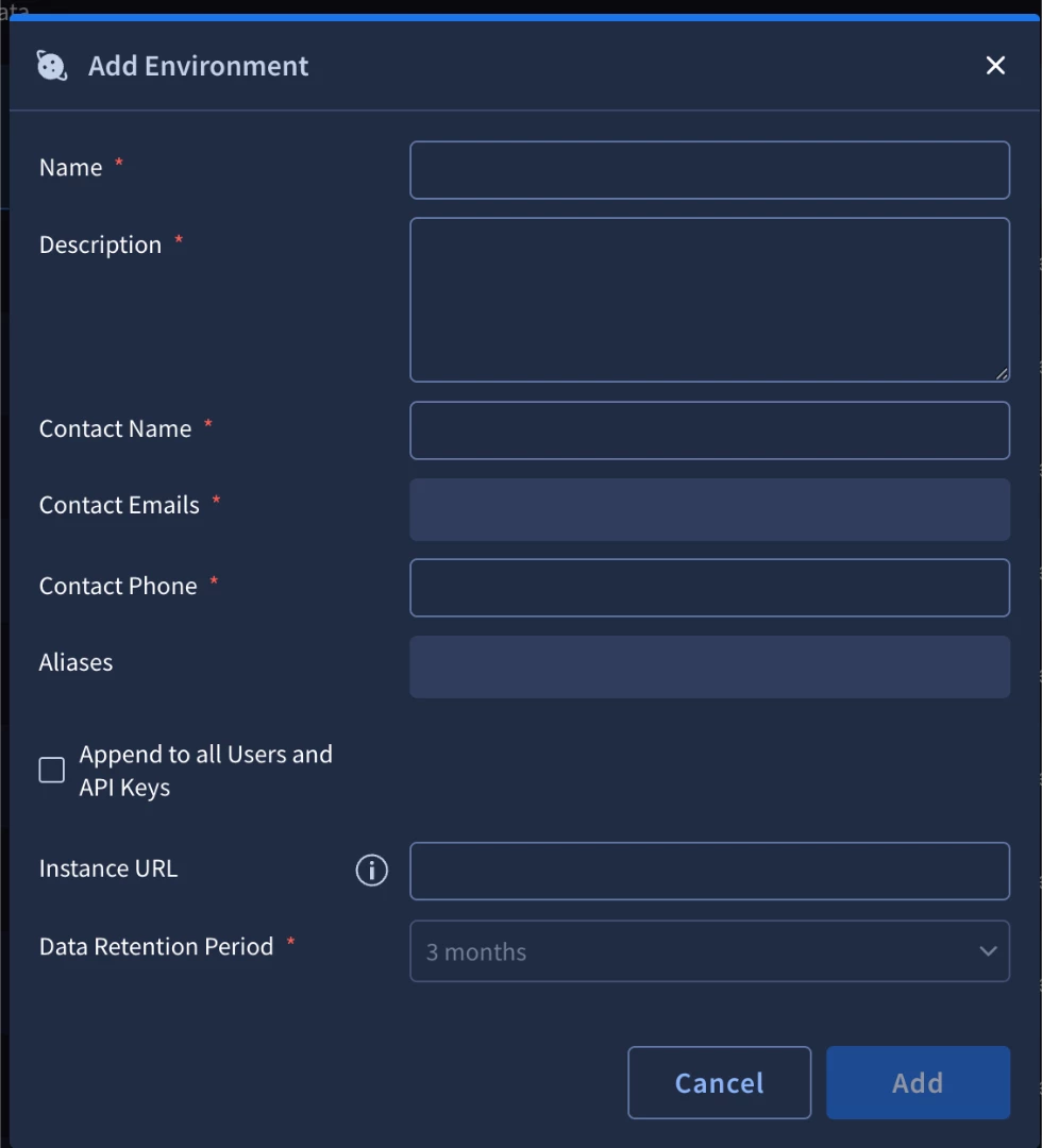 - Configure Access (Optional): Select the option to Append to all Users and API Keys if you want to automatically grant access to this new environment to all existing users and integrations.