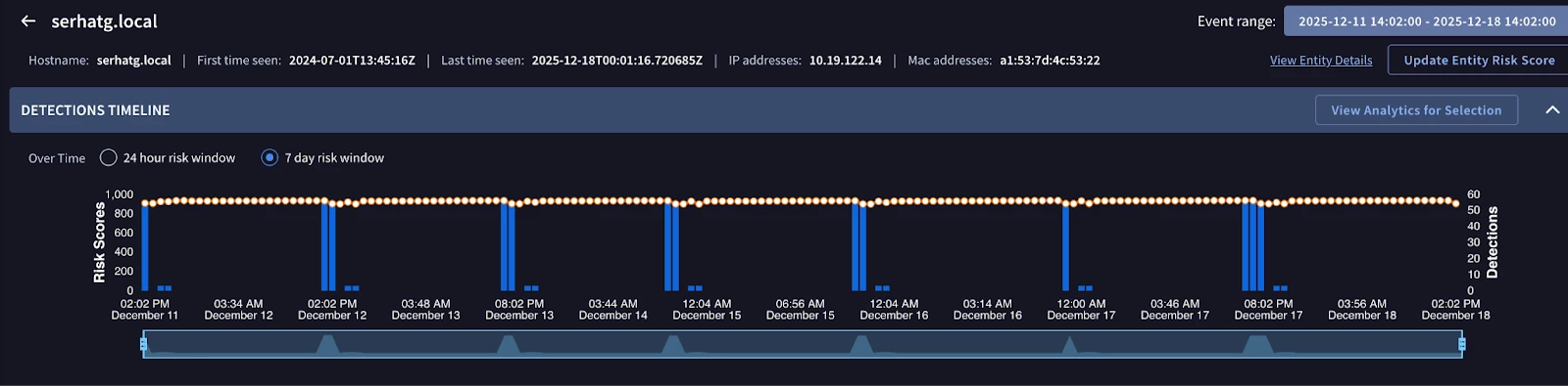 - Max(Finding): The single highest risk score among all active detections for that entity in the risk window.