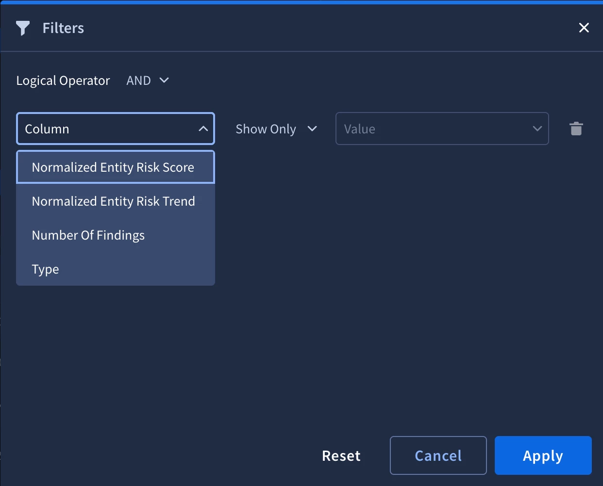 To streamline your workflow, you can use quick filters to drill down into specific investigation objectives. These filters allow you to instantly narrow your search based on critical criteria, such as the total number of findings or a significant increase in risk trends, ensuring you focus on the most impactful data first.