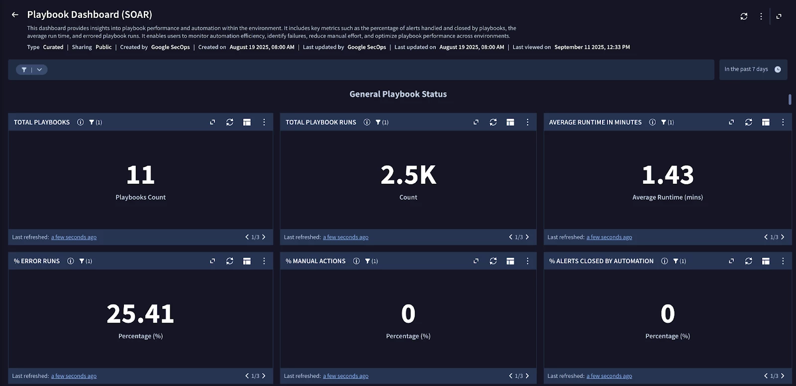 SecOps offers a curated dashboard named “Playbook Dashboard (SOAR)”. This dashboard is a vital tool, presenting a lot of useful information around Playbooks related to their performance, distribution, and errors.