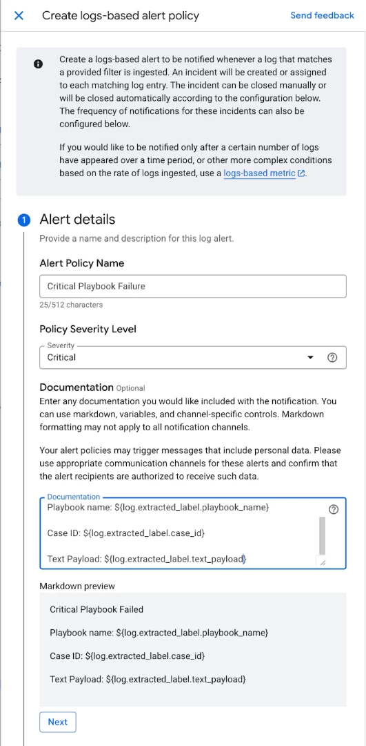 Let’s work through an example of a log based alert where we want to know if a critical playbook experiences failures.