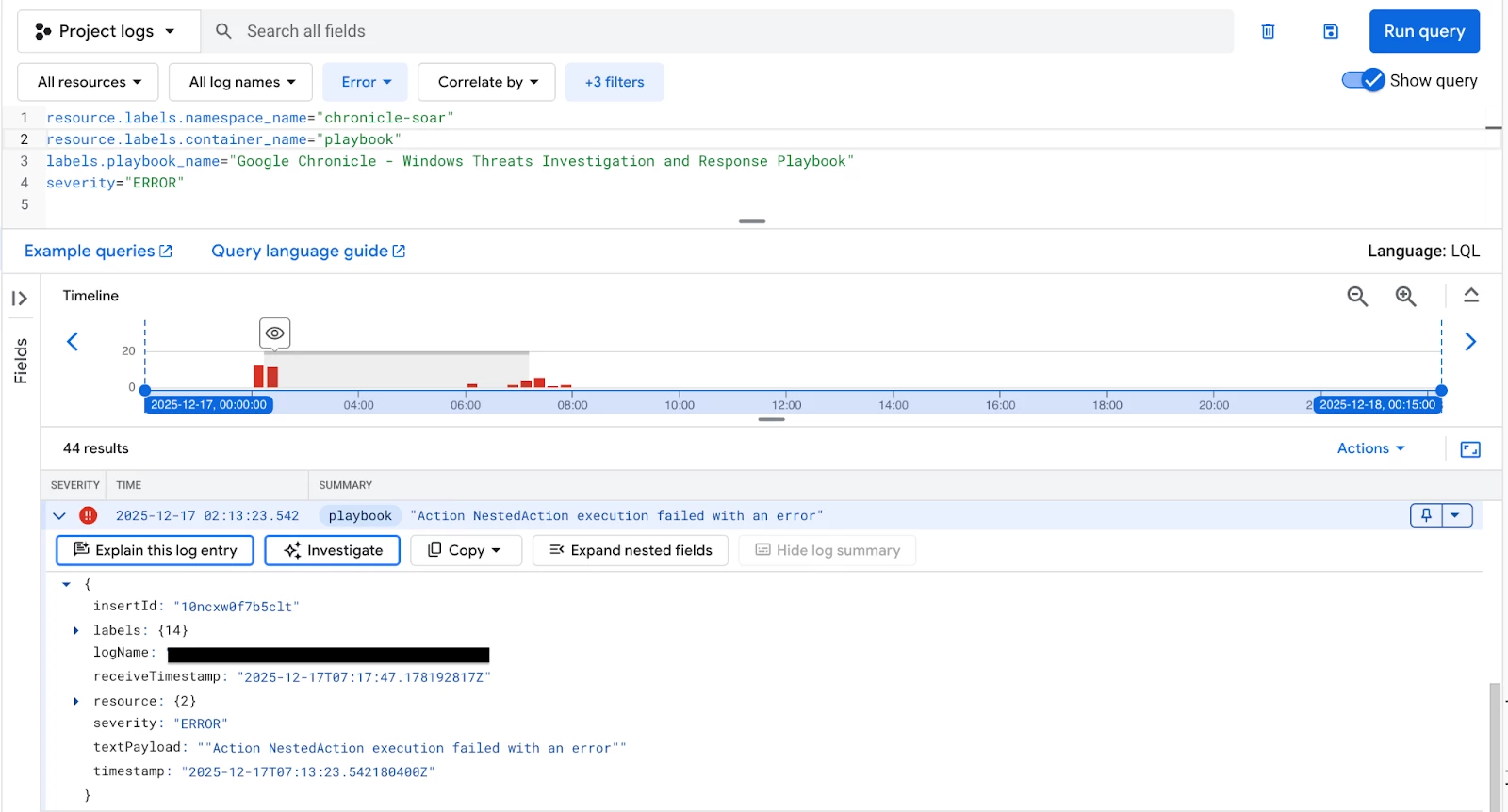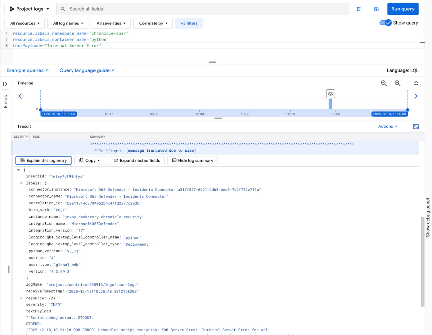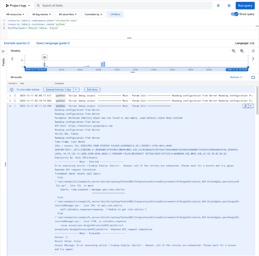 Actions executed by your playbooks, which handle connectors, jobs, and actions, run within the python service container. It is crucial to monitor this service for connector and integration issues. A simple severity filter might not suffice, as an action can "fail" gracefully but still return a problematic result, which is why we inspect the textPayload.