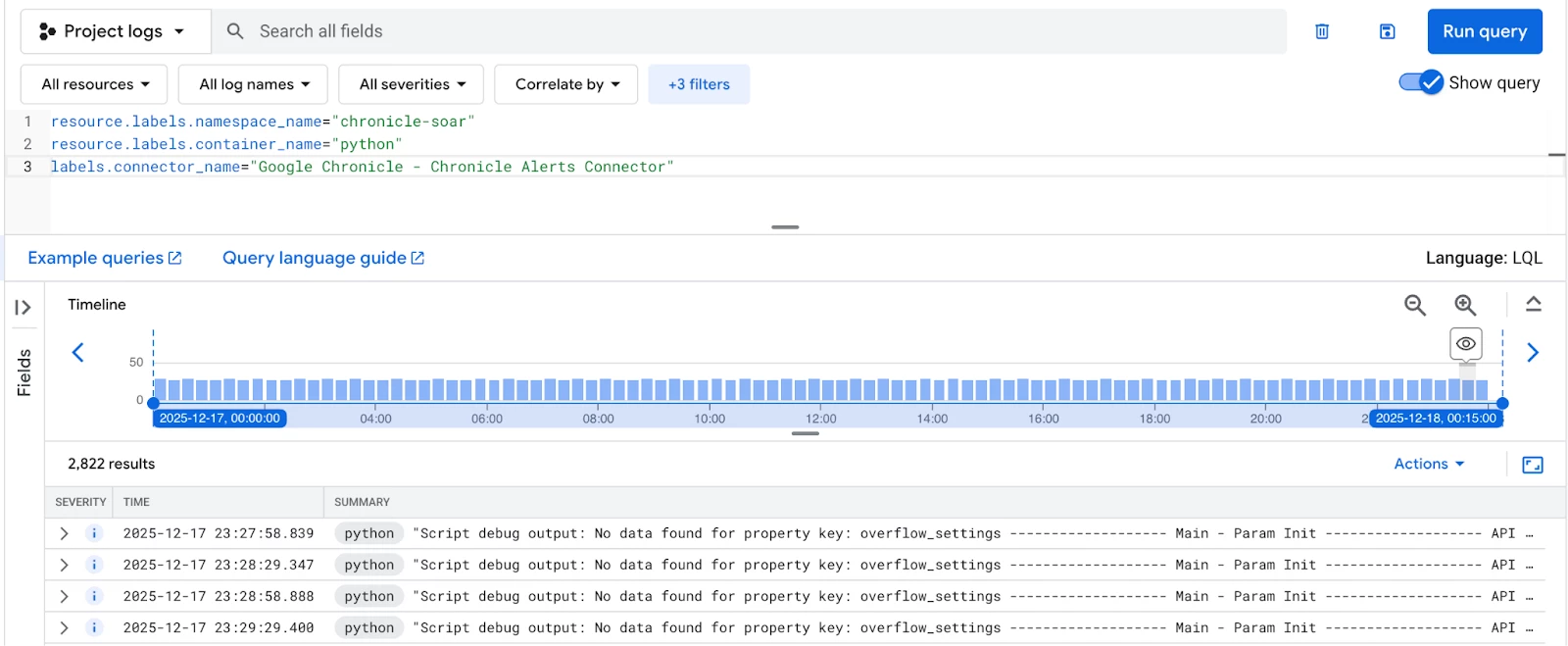 To see all logs from any instance of a Google Chronicle Alerts Connector, combine the namespace, container, and connector labels: