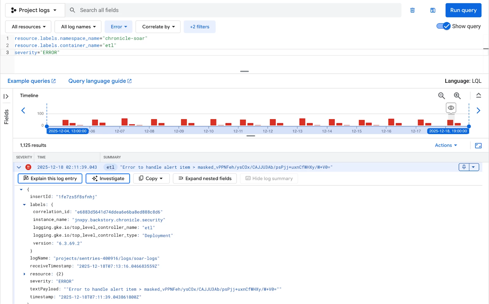 Filter on the “etl” container and look for any log entry with a severity of "ERROR". Consistent ETL errors can indicate issues with data sources or transformation scripts. The only available label for the ETL container is correlation_id.