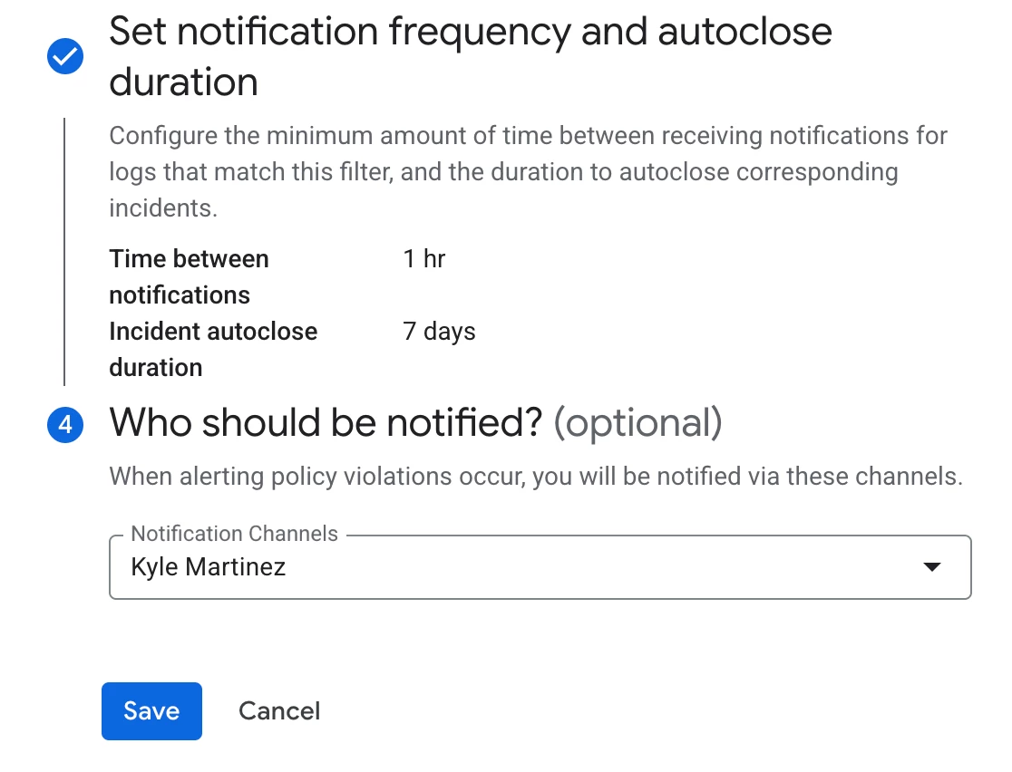 Finally, determine the notification frequency and specify the recipients. While this example focuses on sending an email notification, a variety of notification channels are available, such as Google Chat, Webhooks, and Slack. Further details on notification channels are accessible here.