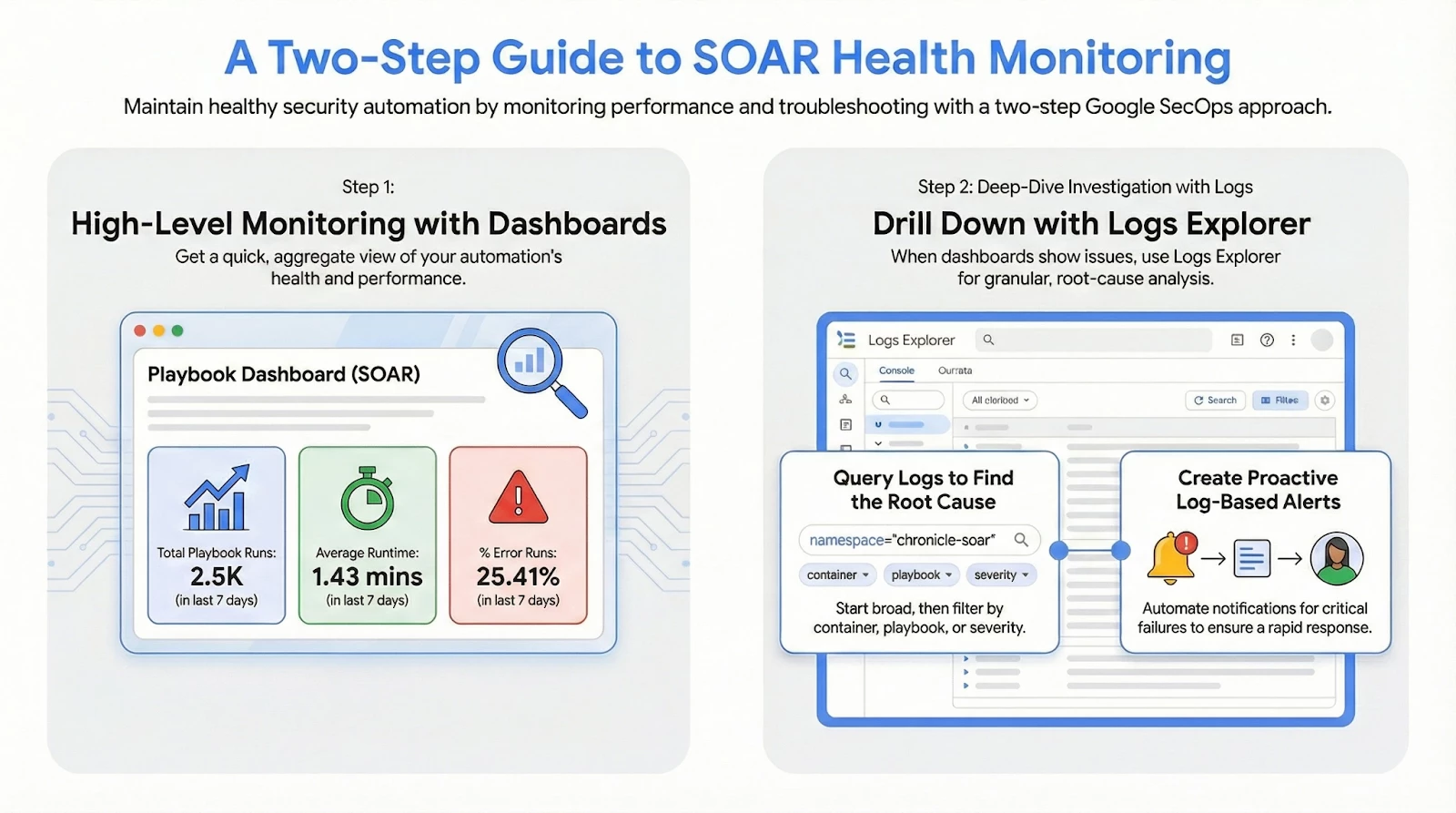 Monitoring the operational health of your SOAR platform is not a one-time task; it is an ongoing necessity for maintaining the integrity and effectiveness of your security automation. By leveraging the Playbook Dashboards for high-level performance metrics and mastering the Logs Explorer for granular debugging and alerting, you are equipped to proactively identify, diagnose, and resolve issues related to: