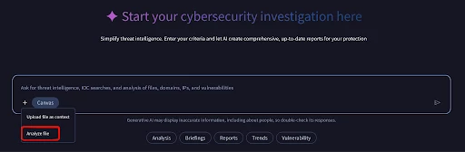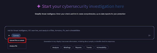 In addition, users can upload files - these can be report templates, best practices, incident response playbooks, etc - for the AI model to be able to leverage them as context.