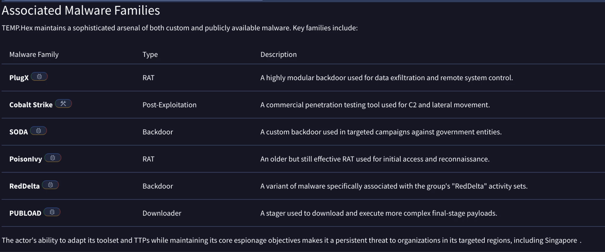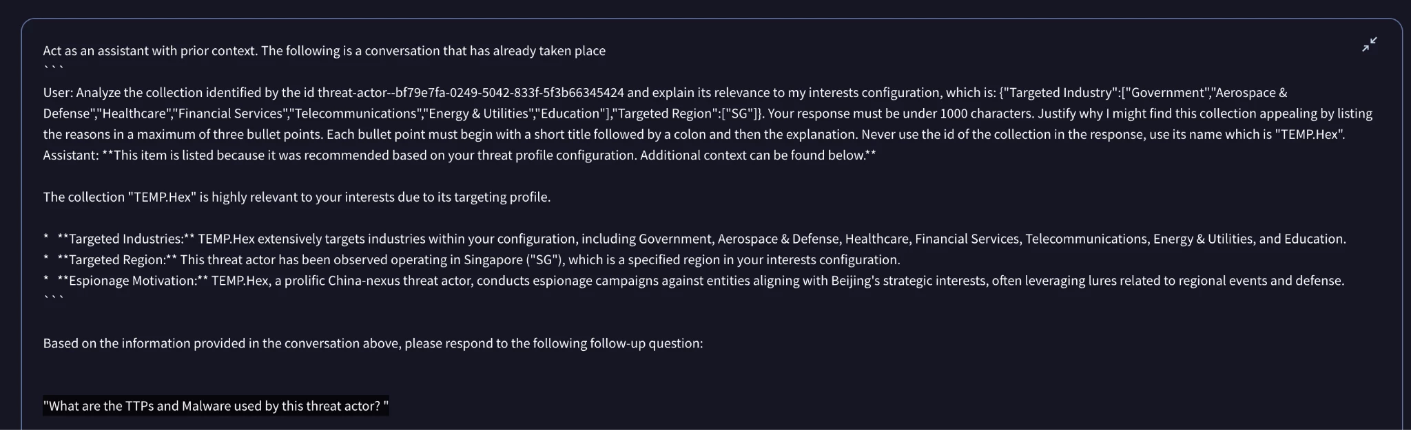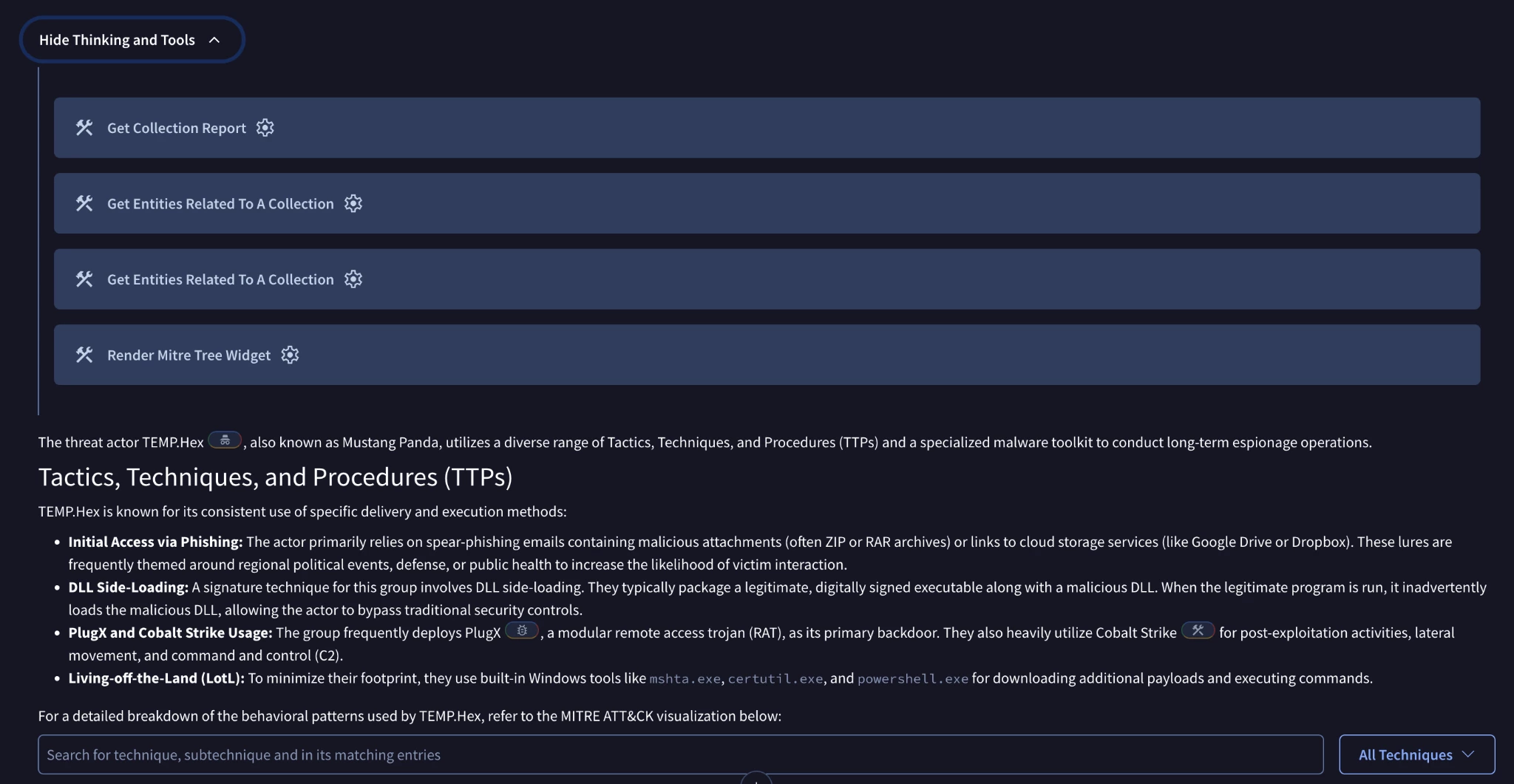 Agentic remembers the context of the question - from the threat profile - and provides information that is relevant. In the example above, it provides a summary of their TTPs, a MITRE ATT&CK render of the Threat Actor, and the associated malware families that were known to be used by the Threat Actor.