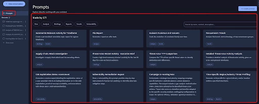 Prompt templates listed under the Made by GTI section serve as a starting point for users to leverage the agentic assistant's capabilities for common and complex security tasks. Templates are tagged to provide insights on the prompt’s objective.