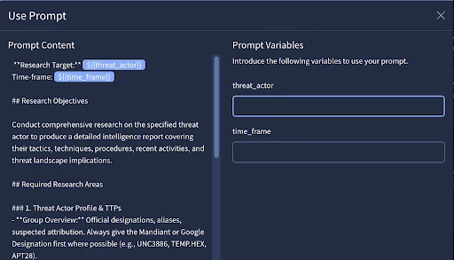 In the Agentic platform, prompts are treated as entities. The Prompts menu in Agentic provides access to a comprehensive list of all available prompts, including pre-built templates from our team and custom prompts that you can create to expedite repetitive tasks within Google Threat Intelligence.