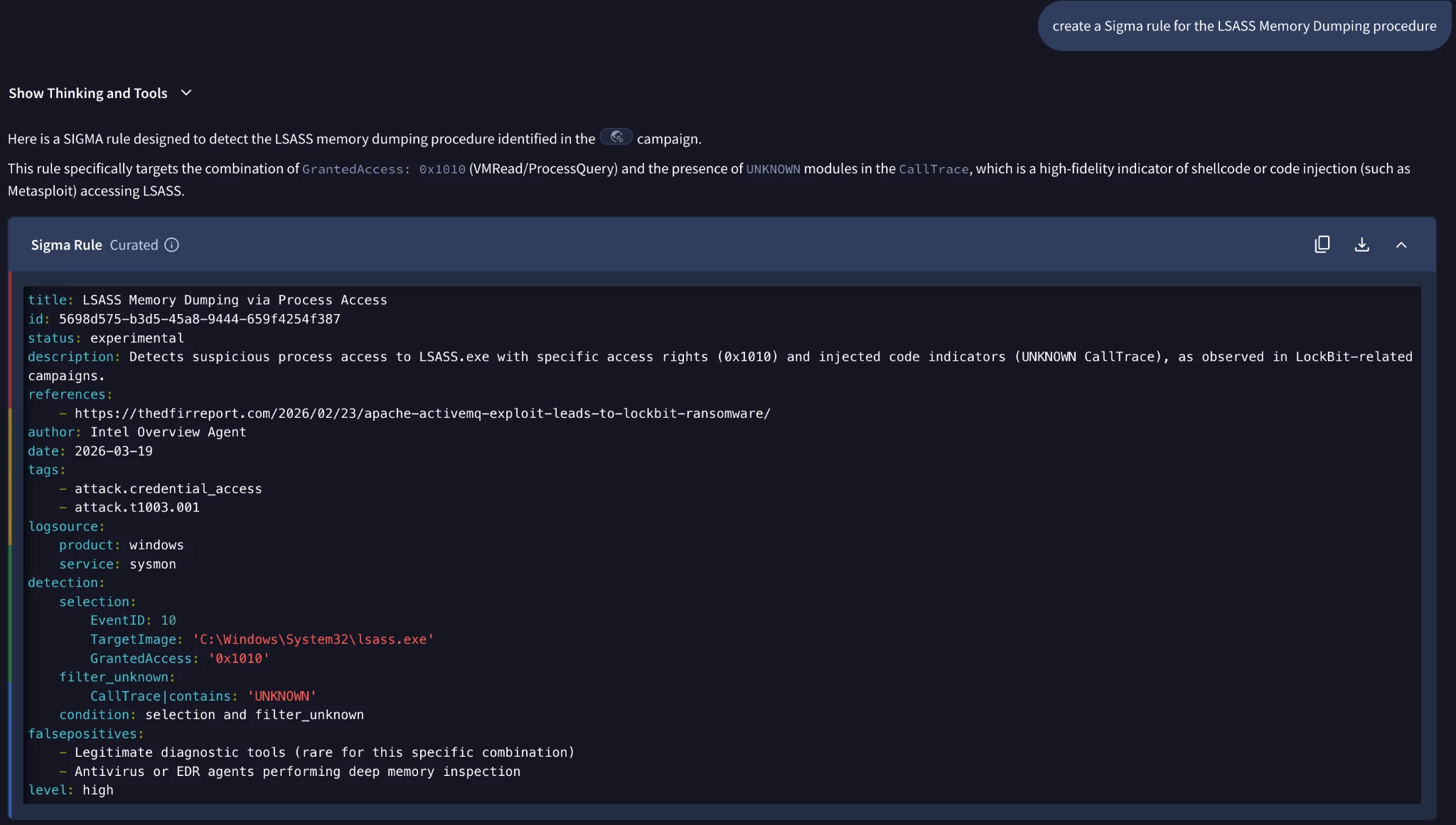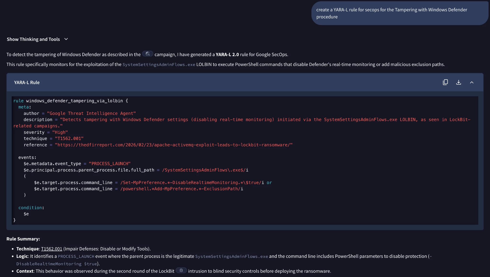 Intelligence Operationalized into Proactive Defense: GTI enables users to quickly operationalize threat intelligence. Security teams can instantly convert analysis (like decompiled code) into deployable hunt packages such as YARA rules, YARA-L rules, and Sigma rules, allowing them to proactively hunt and detect new threats based on the latest attacker TTPs.