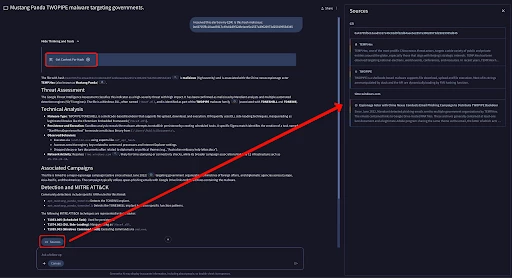 - Retrieval Augmented Generation (RAG): Transcending the limitations of static training data, our agents leverage Retrieval Augmented Generation (RAG) to dynamically harvest high-fidelity, real-time intelligence from our proprietary Threat Analysis Service, ensuring every response is grounded in diverse and authoritative telemetry.