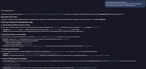 Now that we know the malware’s attribution, we can take it a step further. We can leverage the Reverse Engineer Full Binary Tool to do a deep reverse engineering of the file, and to provide a report with citations to the debug code.