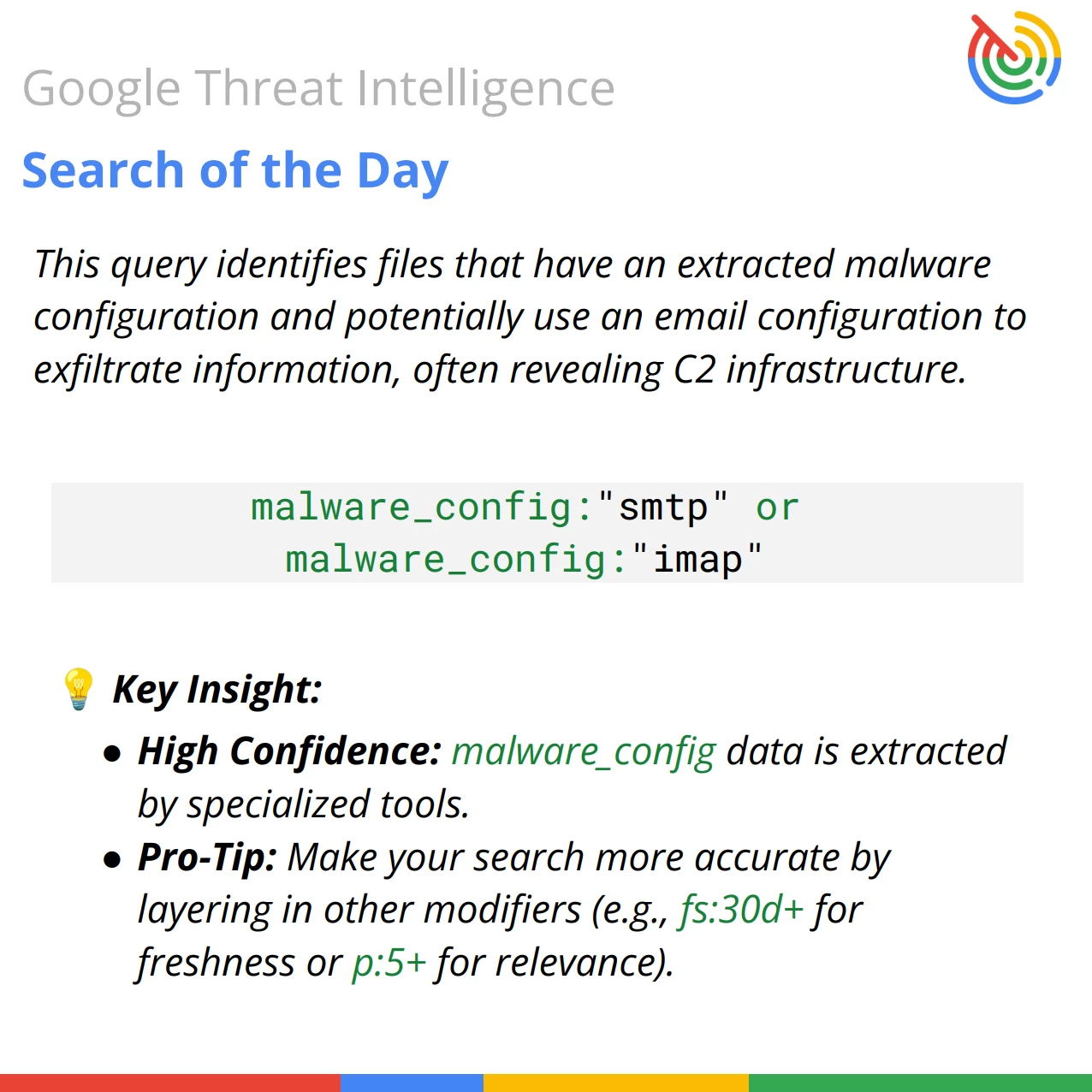 Query Breakdown: The query uses the malware_config modifier, which is a premium VirusTotal Intelligence feature that contains configuration details extracted for specific malware families.