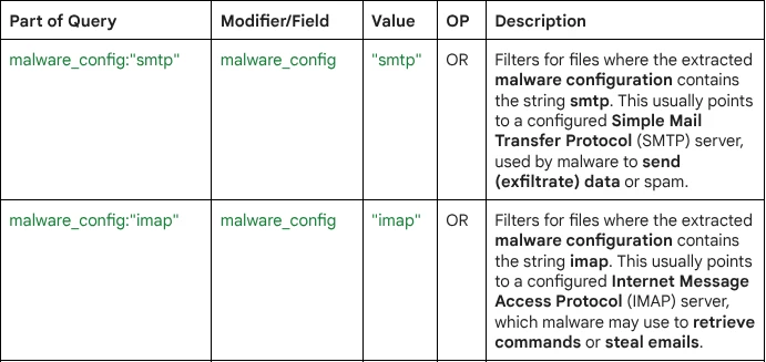 - Configuration Detail: By using the malware_config modifier, the query bypasses searching the file's static content and instead looks in the structured, decrypted configuration data that security tools have already extracted from the sample. This is a high-fidelity way to detect the malware's intended network communication methods.