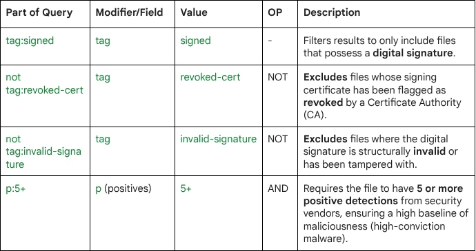 Query Breakdown: The query combines reputation filters (p:5+) with certificate validation tags to isolate threats that are actively attempting to evade detection by leveraging trust.