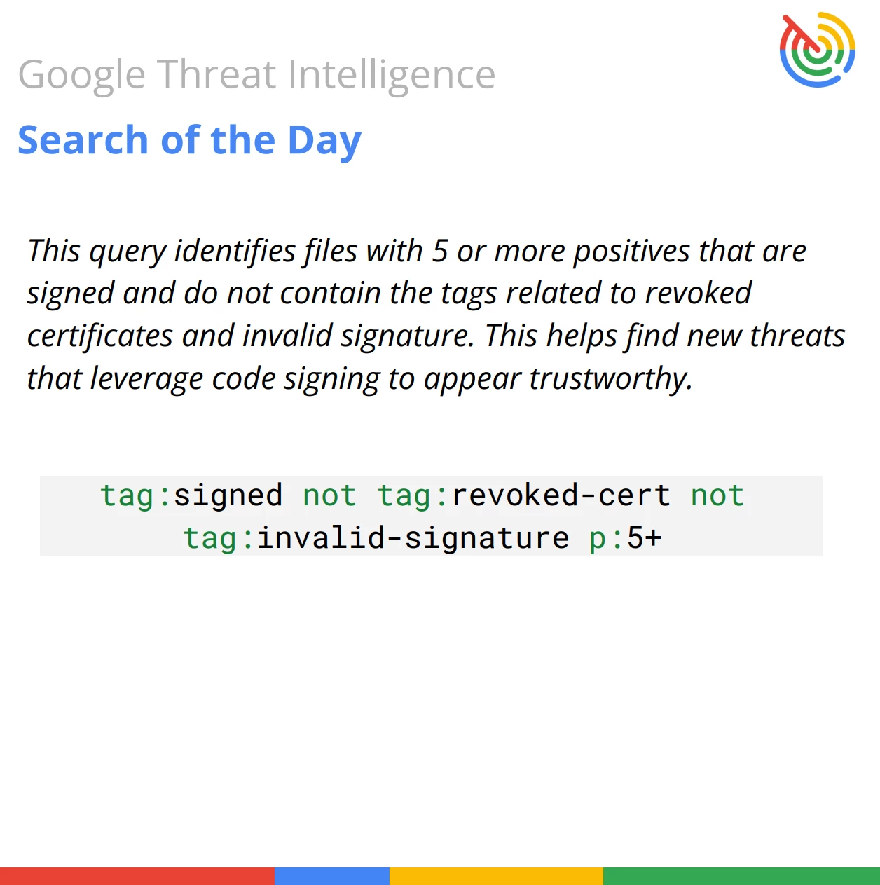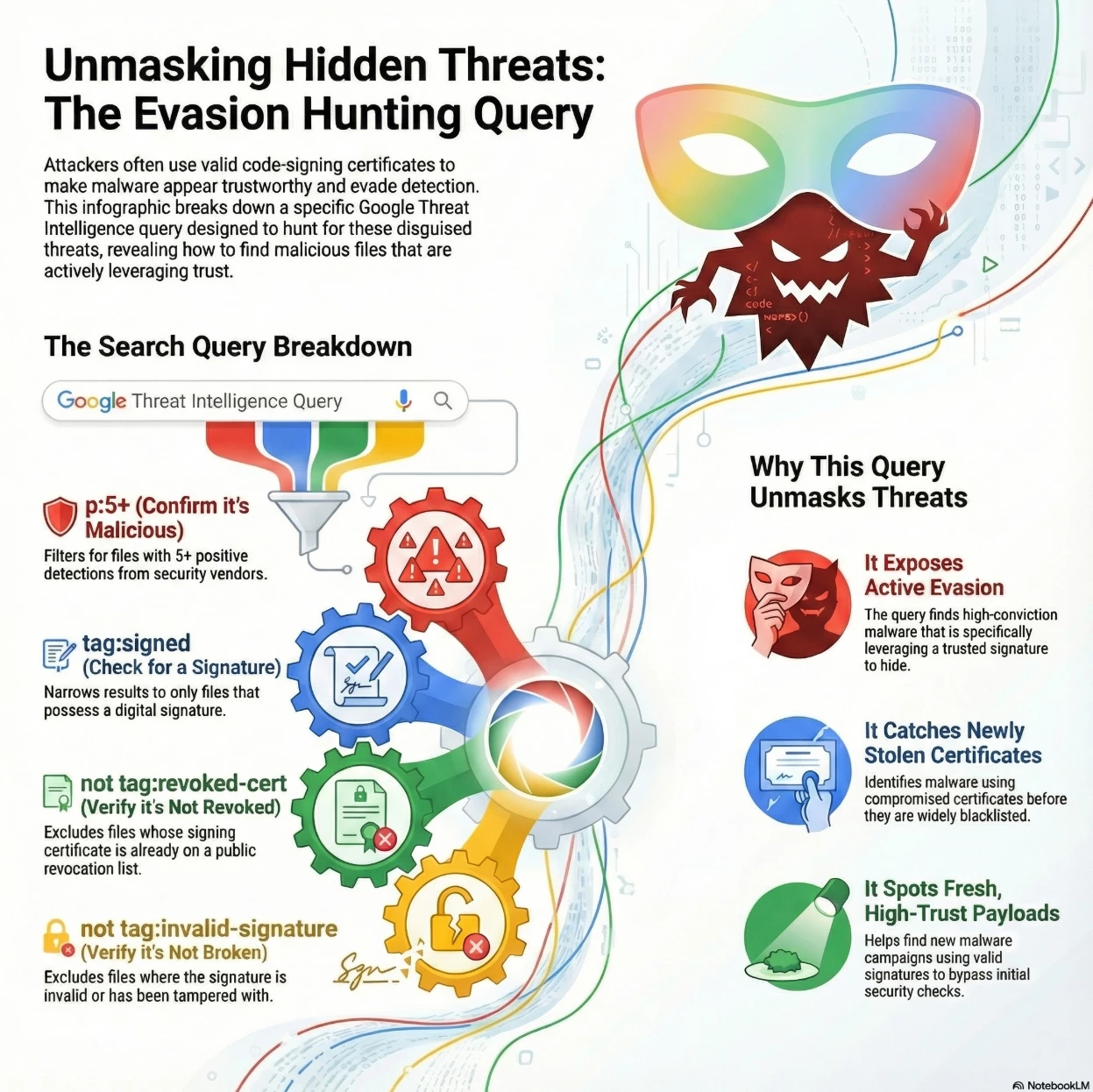 This targeted search is designed to hunt for files that are high-conviction malware but still rely on a valid, non-revoked digital signature. This often points directly to newly stolen code-signing certificates or fresh, high-trust payloads.