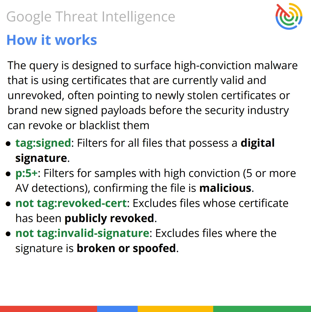 This filter isolates:- Newly Stolen Certificates: Malware signed with a certificate that has been recently compromised but not yet added to Certificate Revocation Lists (CRLs).