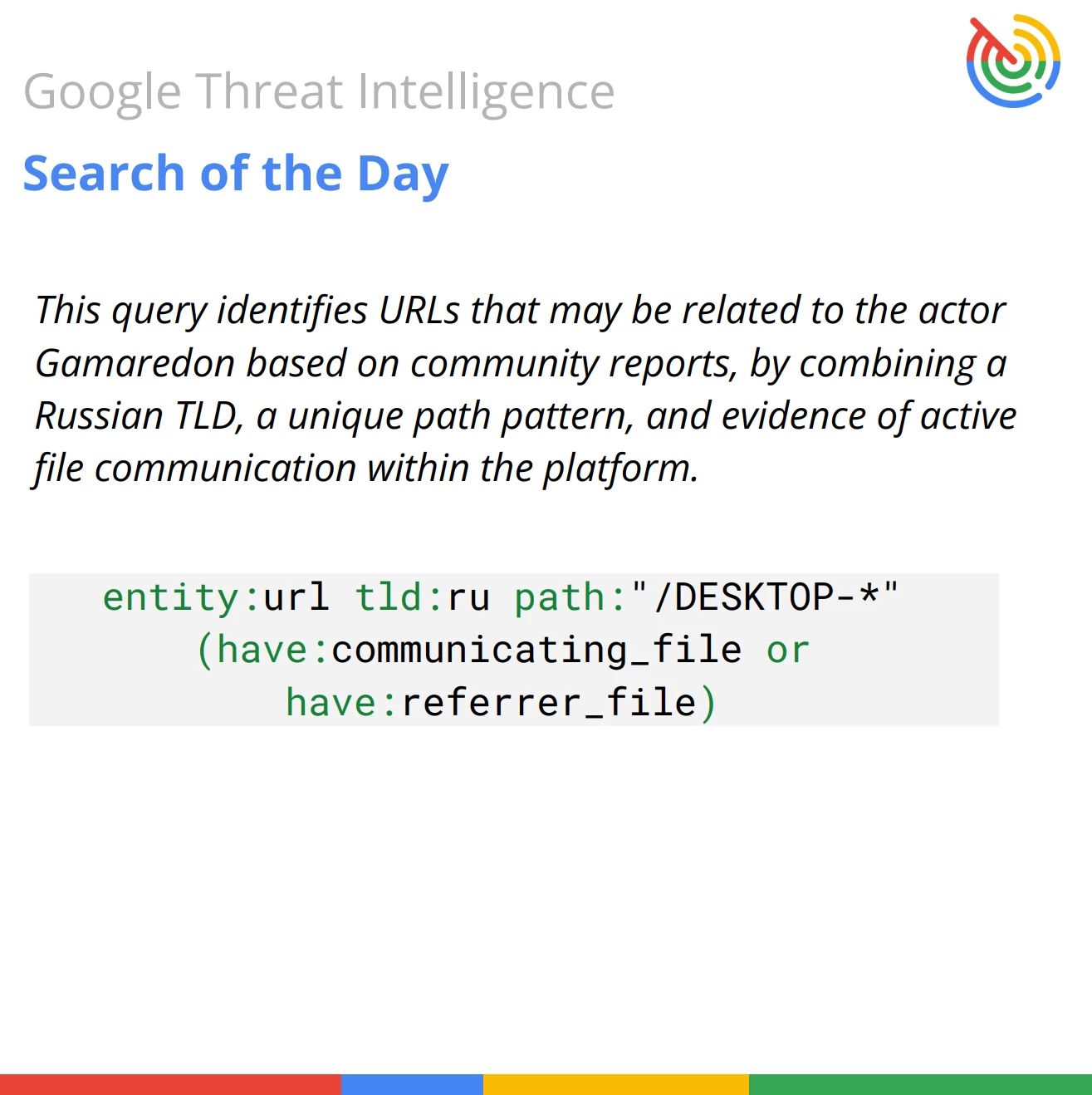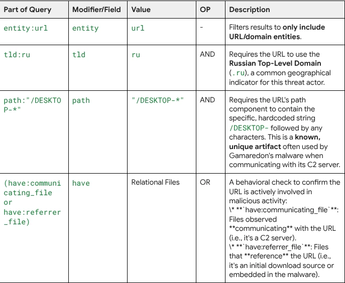 Query Breakdown: The query focuses on specific geographical and technical indicators tied to Gamaredon's C2 infrastructure, combined with a behavioral check to ensure the URL is actively malicious.