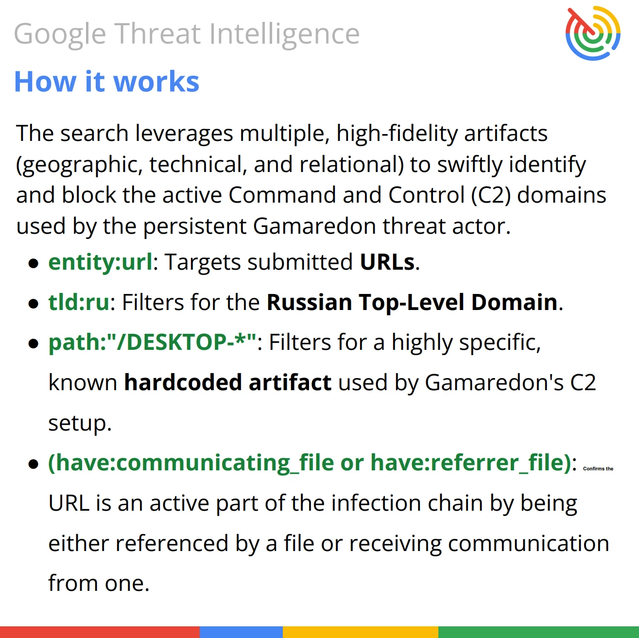 Summary of Intent: The overall goal is to use a combination of high-fidelity, hardcoded indicators to precisely identify active Gamaredon C2 infrastructure.