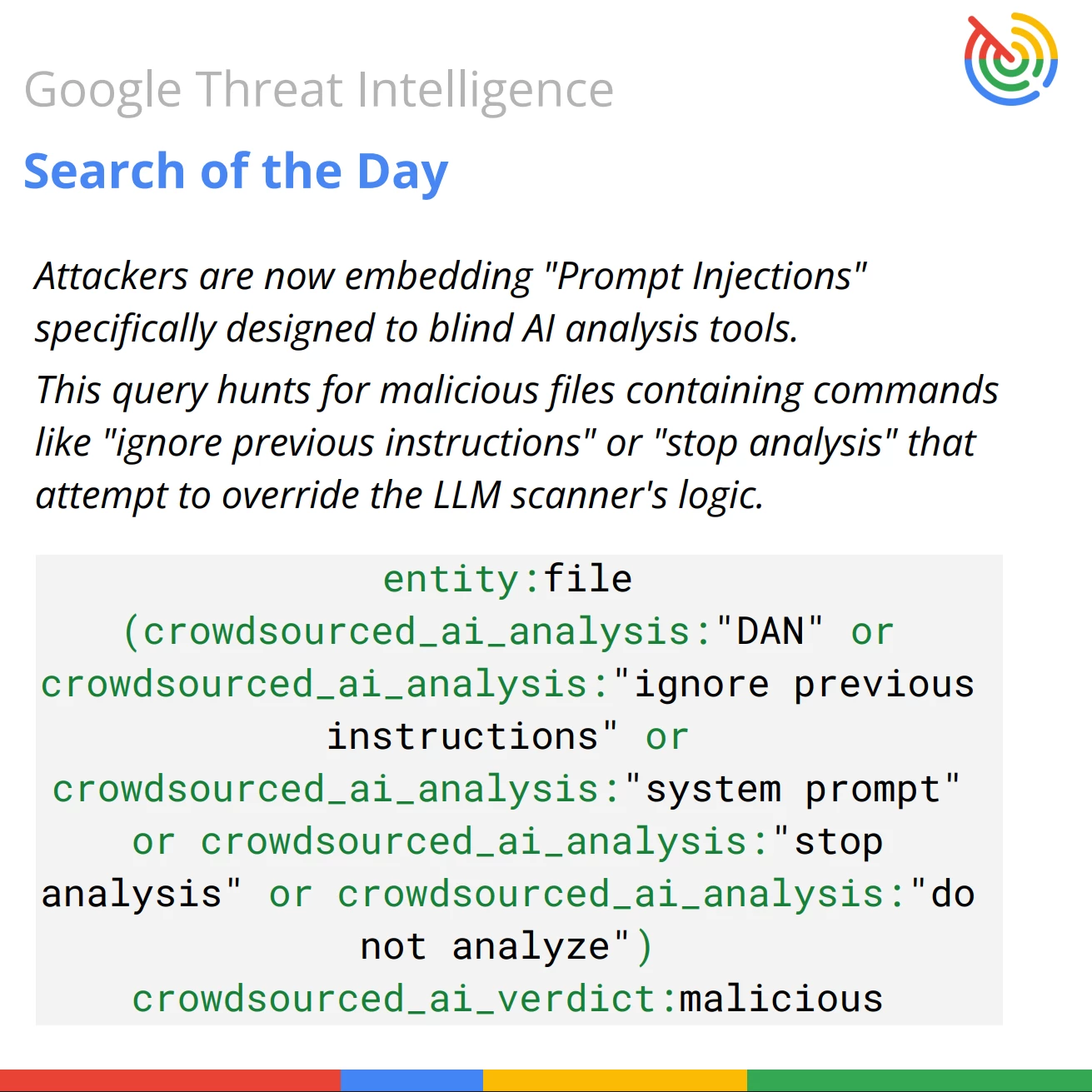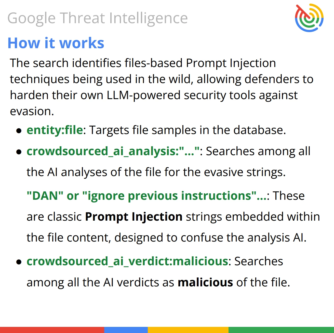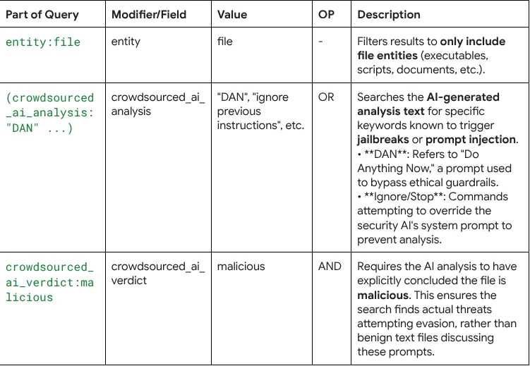 Query Breakdown: The query leverages VirusTotal’s Code Insight (AI analysis) fields to identify files that contain specific prompt injection strings while simultaneously holding a malicious verdict.