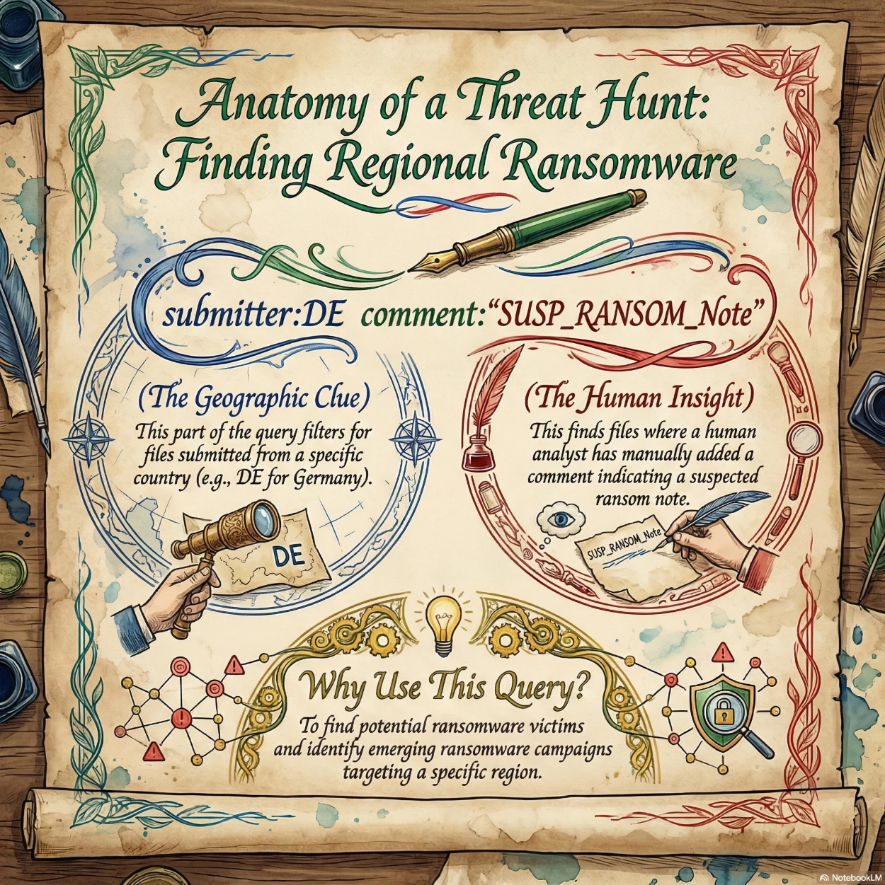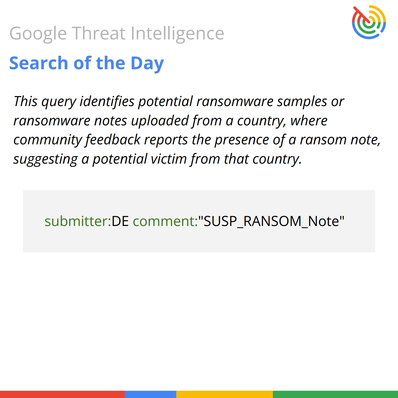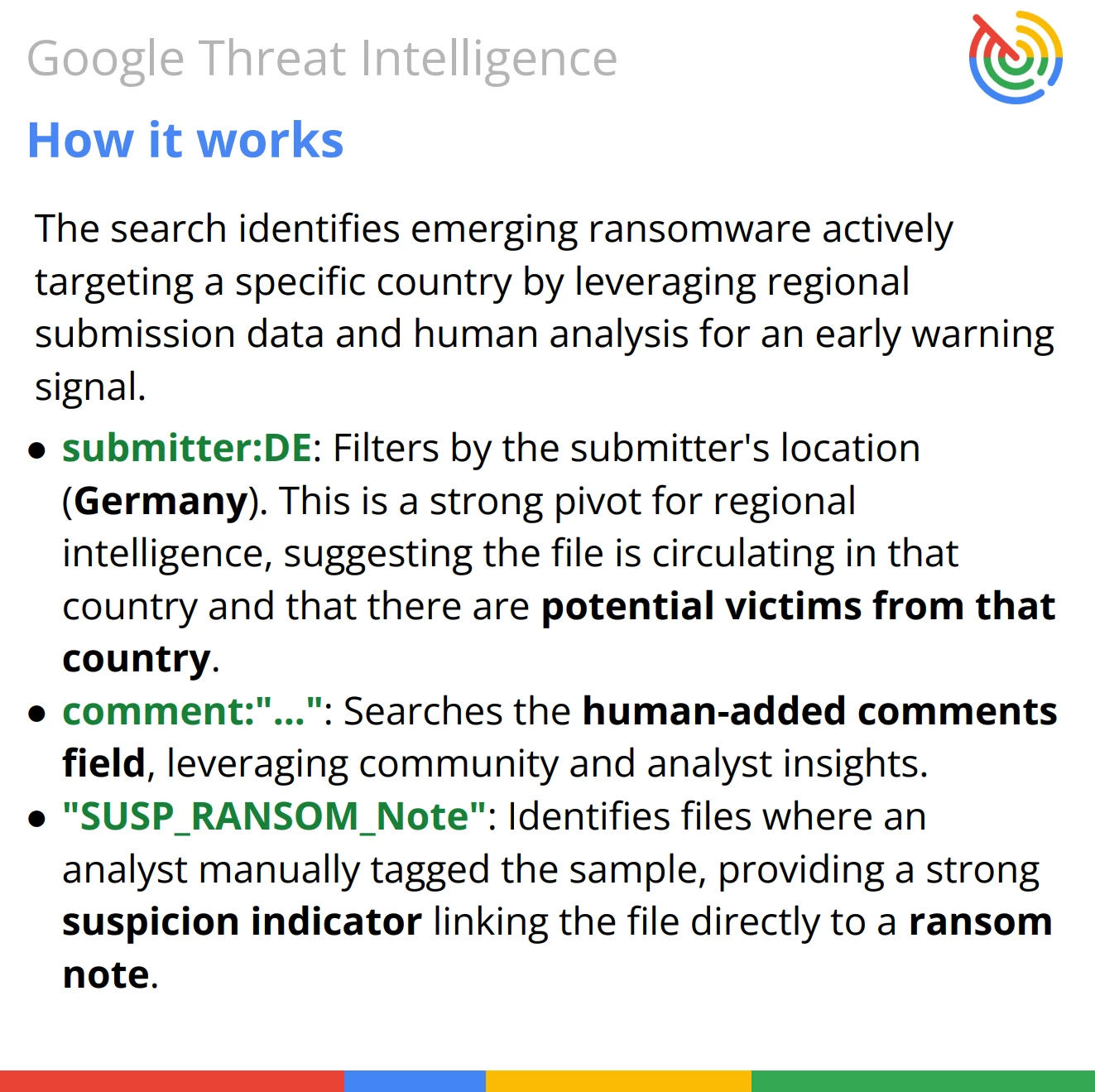 This Google Threat Intelligence search query is designed to identify files submitted from specific countries, along with community feedback indicating the presence of a Ransom note, which strongly suggests a potential victim from that country and is sharing that intelligence.