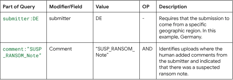 Query Breakdown: The search looks for files submitted from the specified country along with specific tag/comment from the human analyst that submitted the file, which indicates the file is a suspected Ransomware Note.