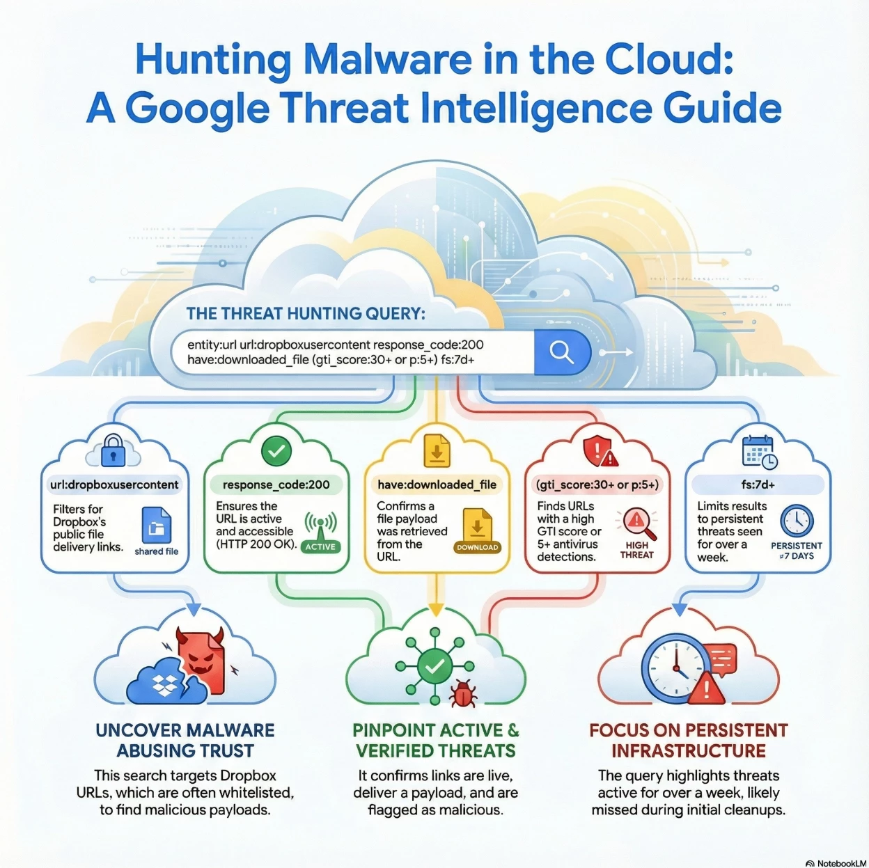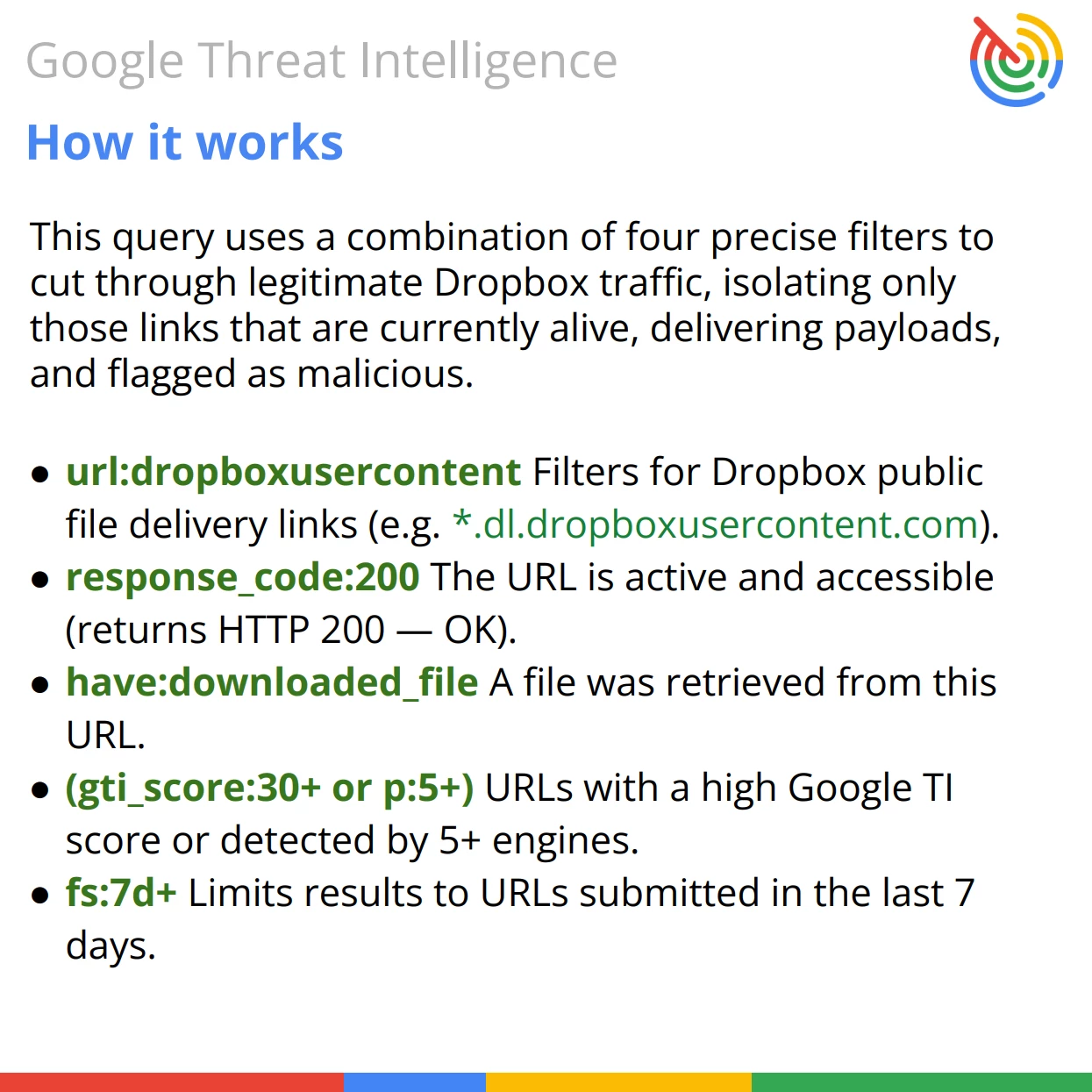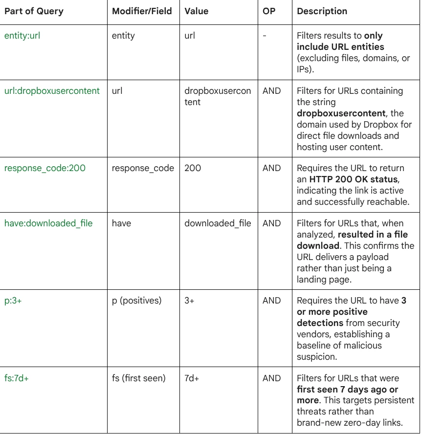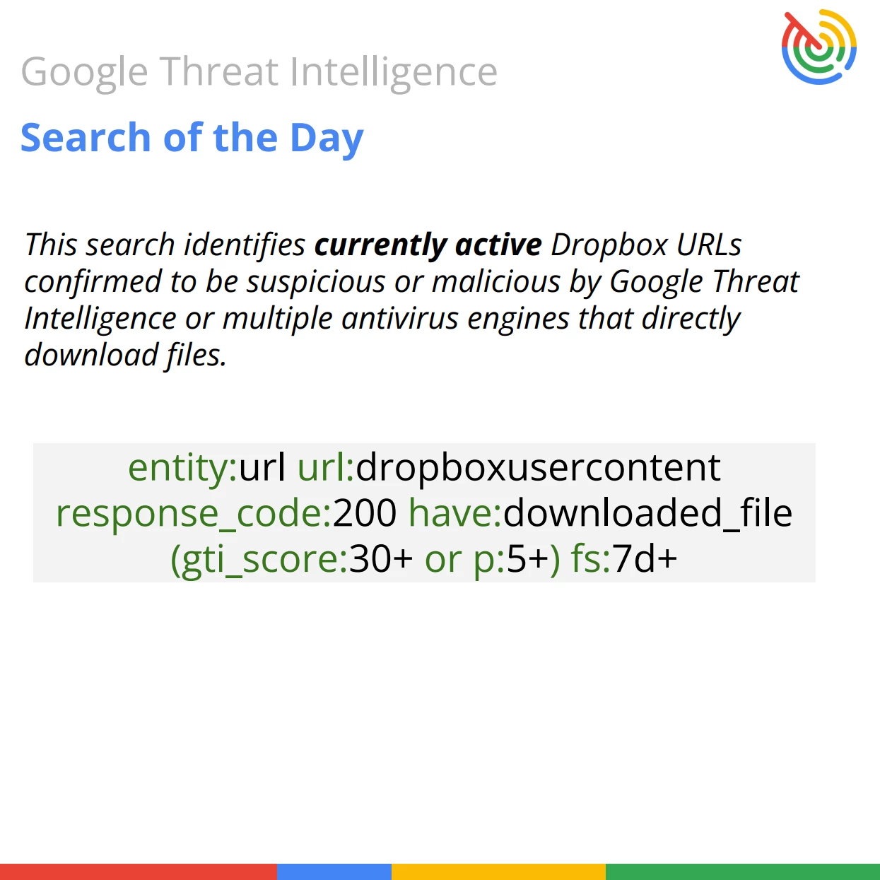 This Google Threat Intelligence search query is designed to identify currently active Dropbox URLs that directly download files and are already confirmed to be suspicious by multiple antivirus engines.