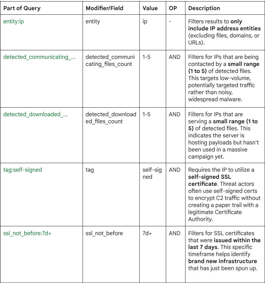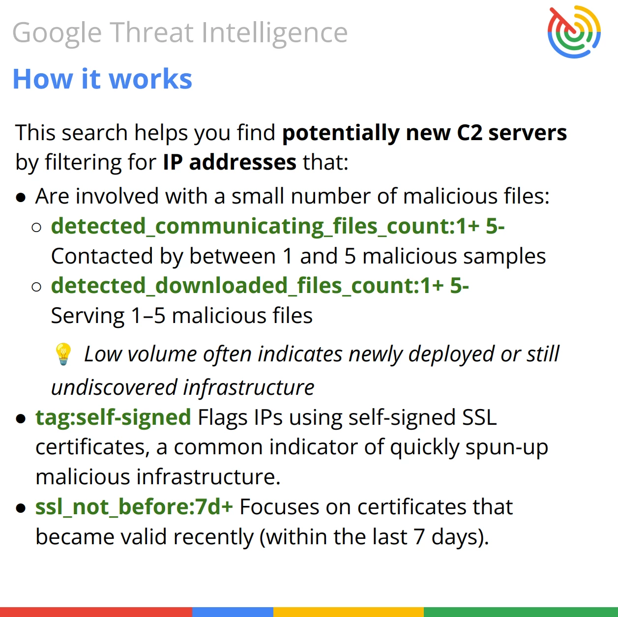 - Recency: It ensures the infrastructure is new by checking the certificate issuance date (ssl_not_before:7d+), catching the threat shortly after deployment.