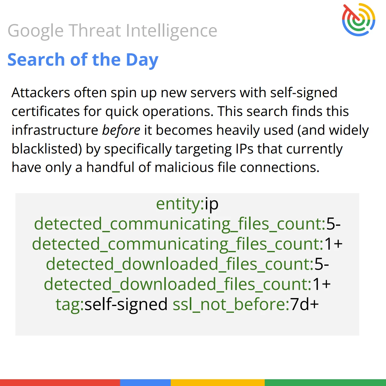Query Breakdown: The query combines entity filters, file count statistics, and SSL certificate metadata to isolate fresh, low-volume threats.