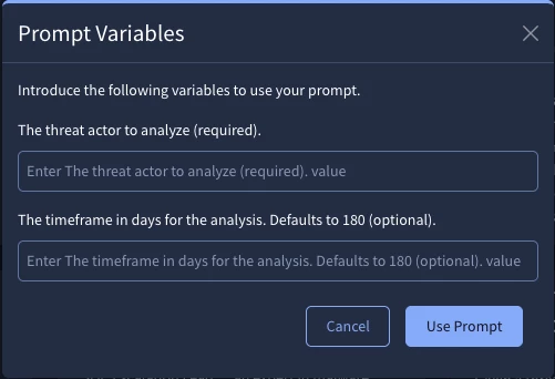 - Replace Static Text: Go back through your prompt and replace the original static text (APT28, 180 days) with the variable names (ACTOR, TIMEFRAME).