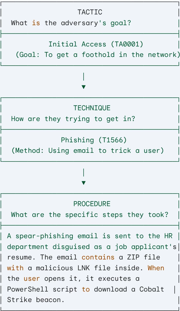 - Procedure: The specific, detailed implementation of a technique. This describes the exact steps and tools an adversary uses to perform the technique. Example: A procedure for "Phishing" would describe the specific email content, the type of attachment used (e.g., a macro-enabled Word document), and the target selection.