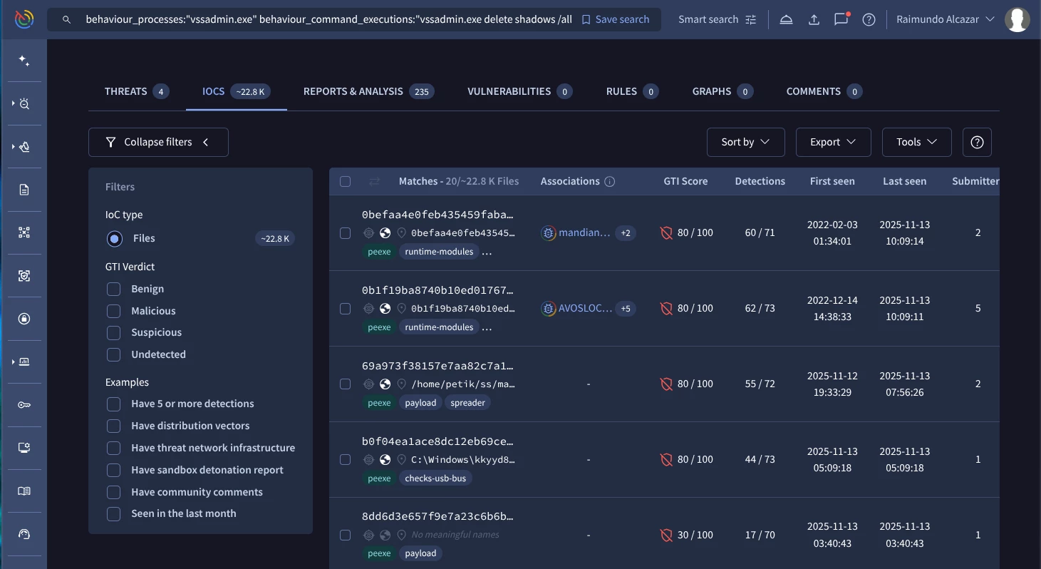 behaviour_processes:"vssadmin.exe" behaviour_command_executions:"vssadmin.exe delete shadows /all /quiet" (Google TI link)